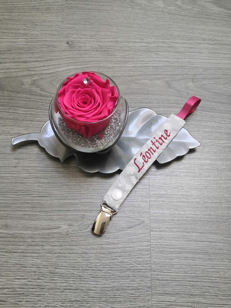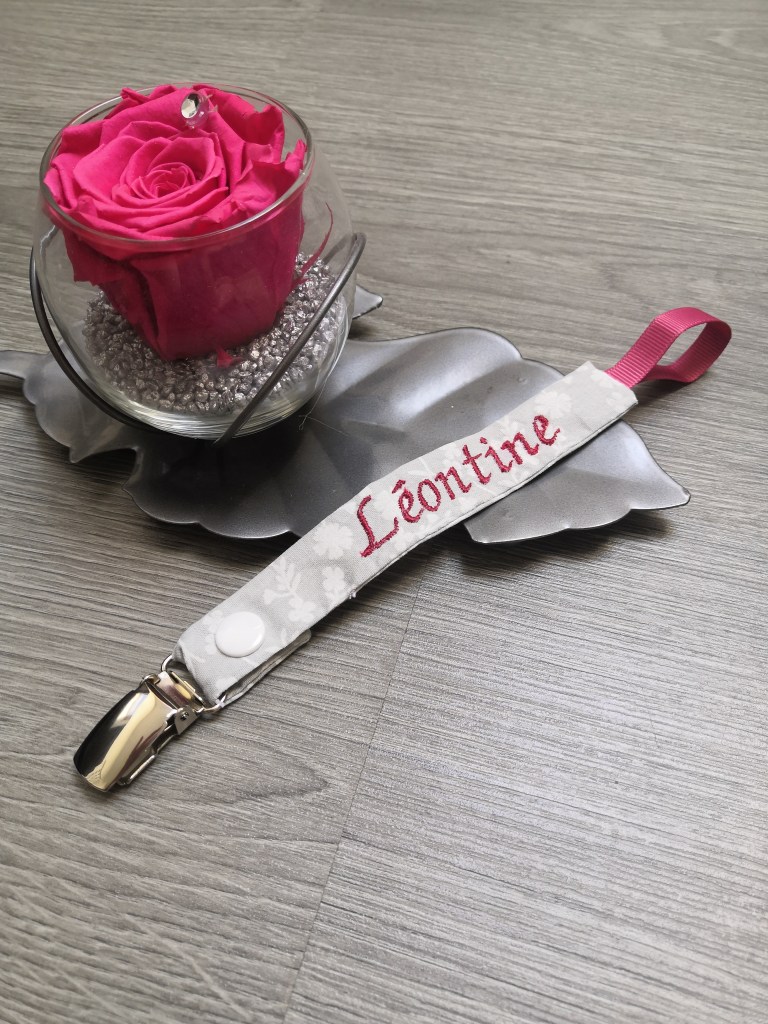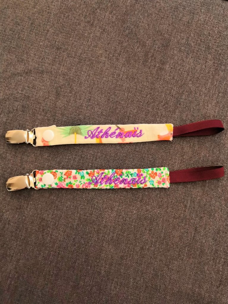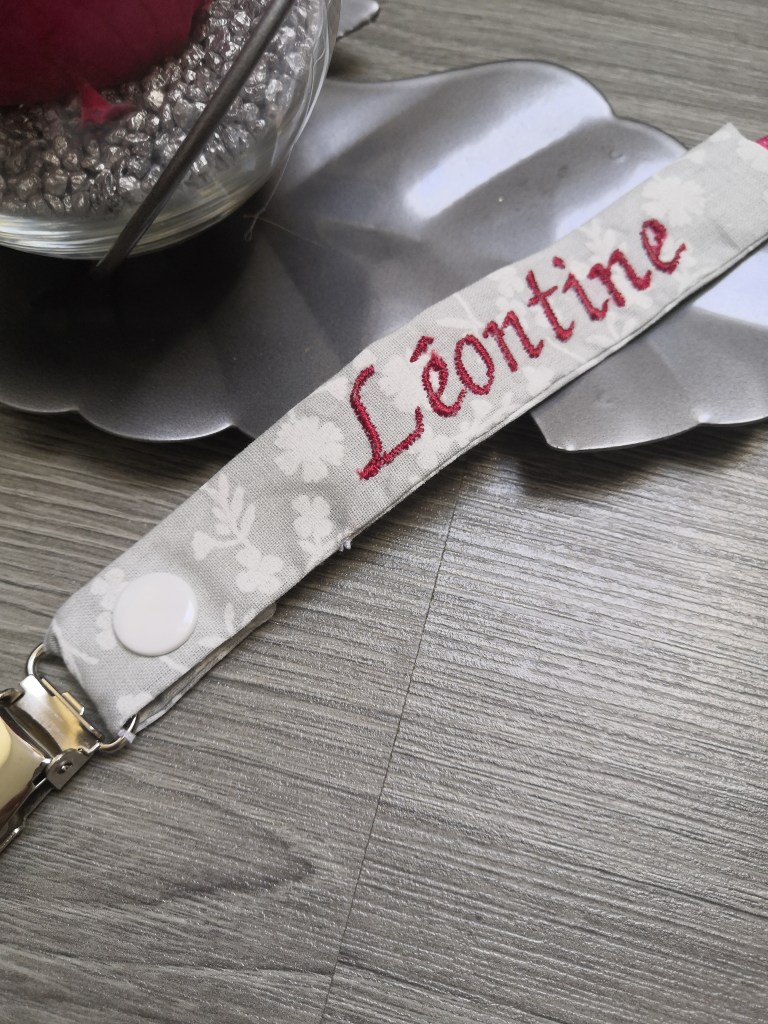 Une attache sucette en tissu, avec un clip en métal. J’ai rajouté une pression, pour pouvoir la détacher, et la laver.