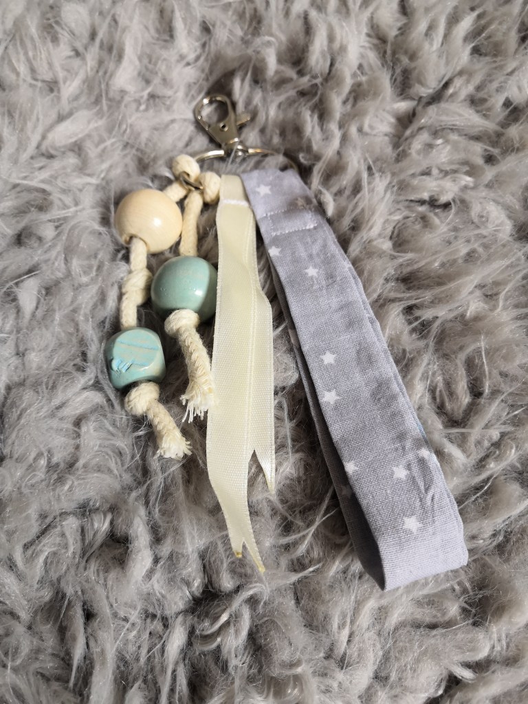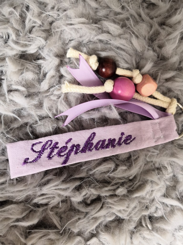 Je vous propose un joli petit porte clef. Il est composé de rubans, de perles, et d’un tissu sur lequel vous pourrez inscrire un prénom, un mot (maison, boulot, etc …) ou juste purement décoratif. Tout est possible, et personnalisable .