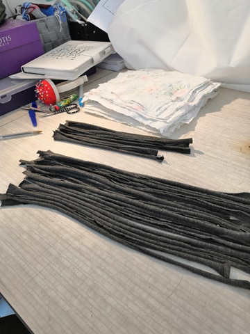 Petite info : si vous n’avez pas d’élastique ou de rubans, vous pouvez les créer vous mêmes avec un t-shirt en coton, un tissu extensible ou des collants, chaussettes. Il suffit de couper des bandes d’environ 0,5 cm de largeur, tirer bien dessus, et couper à la longueur souhaitée. (Voir sur Youtube si besoin, le tuto Traphilo)