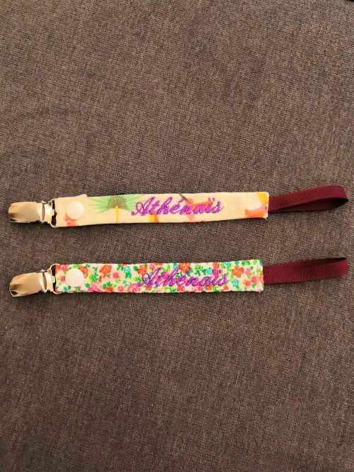 Une attache sucette en tissu, avec un clip en métal. J’ai rajouté une pression, pour pouvoir la détacher, et la laver. Différents coloris disponible, et possibilité ou non de rajouter un prénom ou un mot brodé. Prix moyen : 8 €